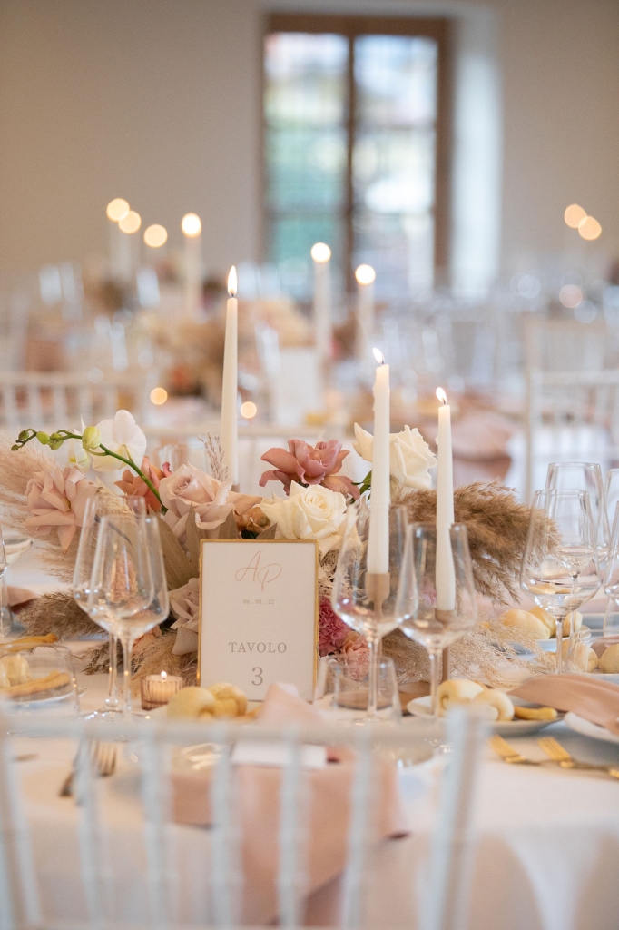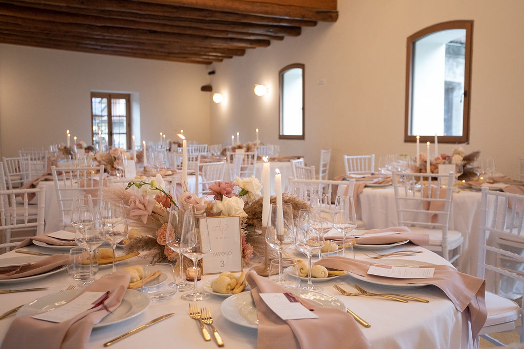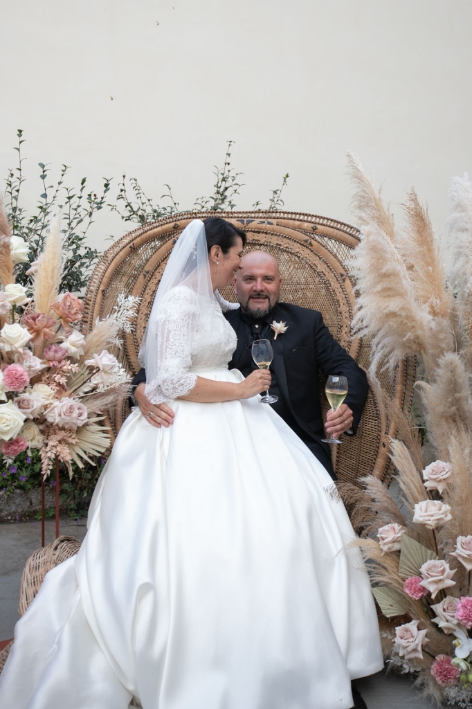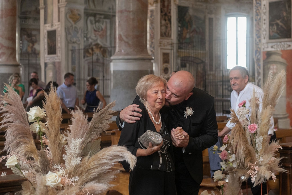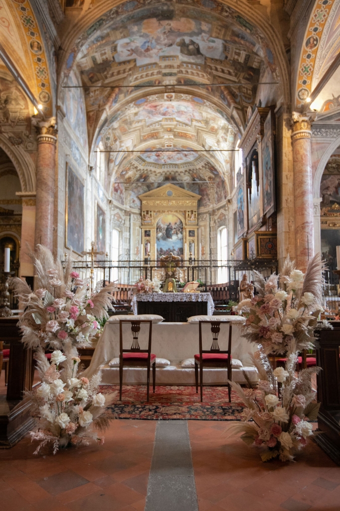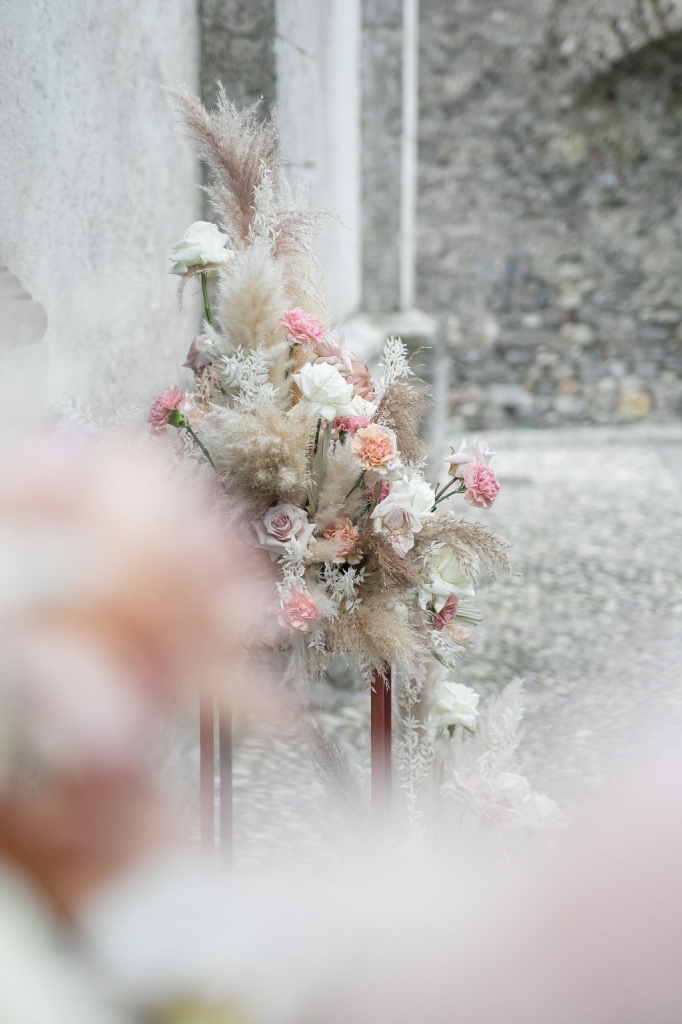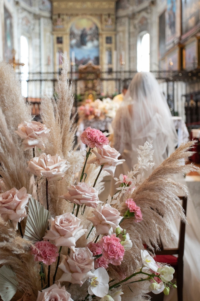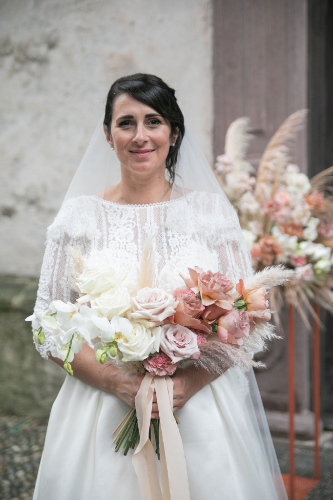 Pamela and Alberto were already a family but, after having suffered a lot during the pandemic, they decided to celebrate their love with their beloved ones. They live on Lake Iseo and they chose to get married in the amazing Basilica of Lovere. For their reception, they chose an historical venue in Vallecamonica, sourrounded by vineyards. Blush pink, soft natural colours, giant roses and pampas grass were the leading elements of the mood.