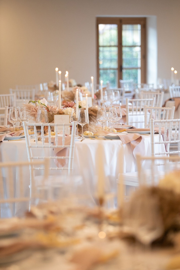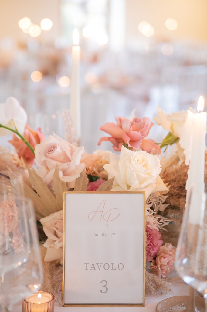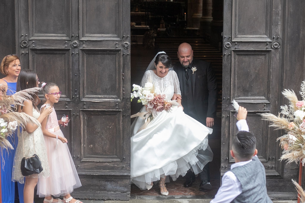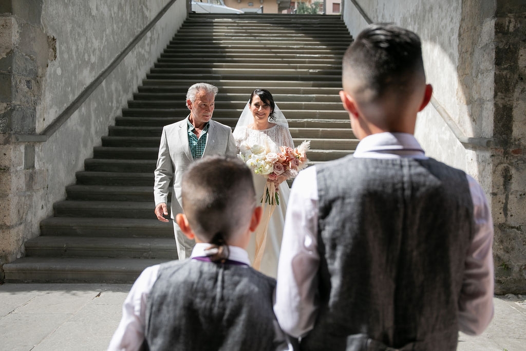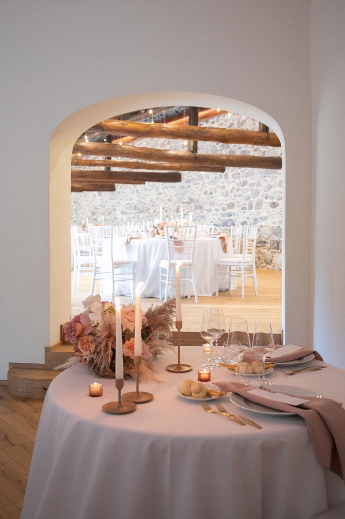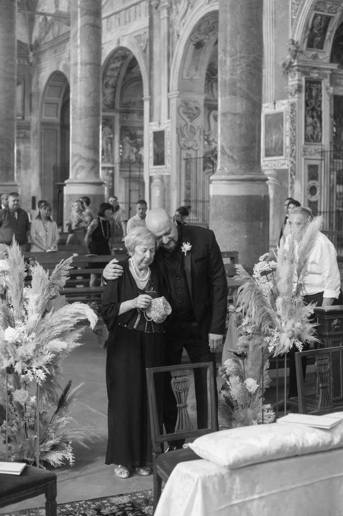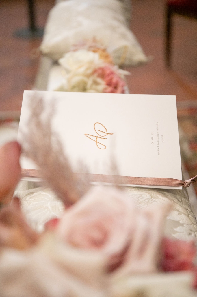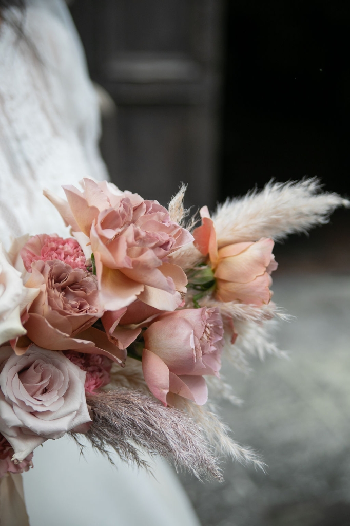 Pamela and Alberto were already a family but, after having suffered a lot during the pandemic, they decided to celebrate their love with their beloved ones. They live on Lake Iseo and they chose to get married in the amazing Basilica of Lovere. For their reception, they chose an historical venue in Vallecamonica, sourrounded by vineyards. Blush pink, soft natural colours, giant roses and pampas grass were the leading elements of the mood.