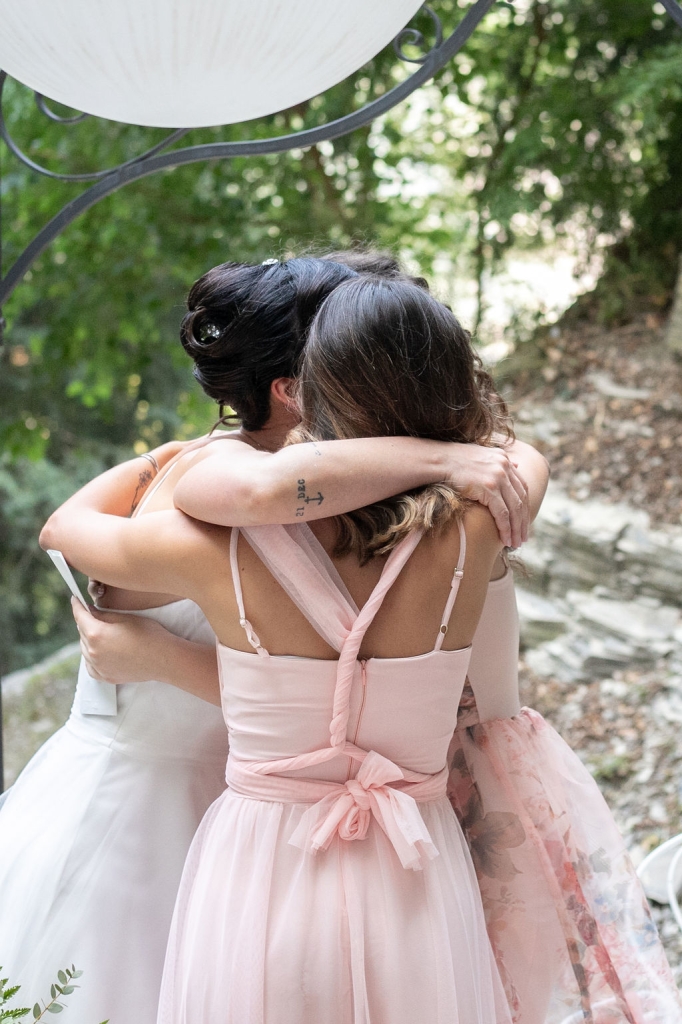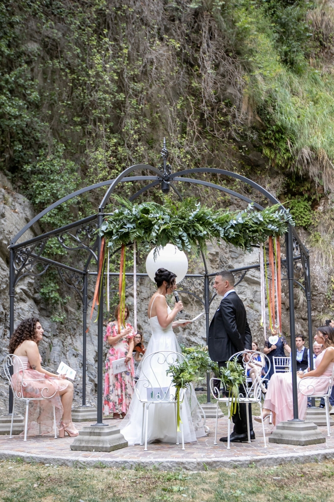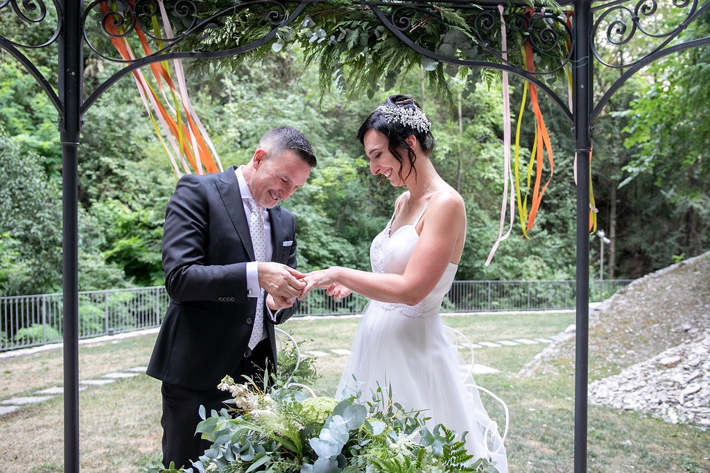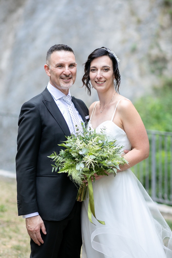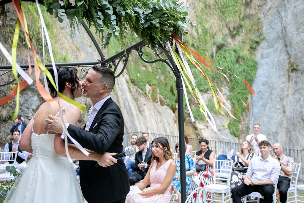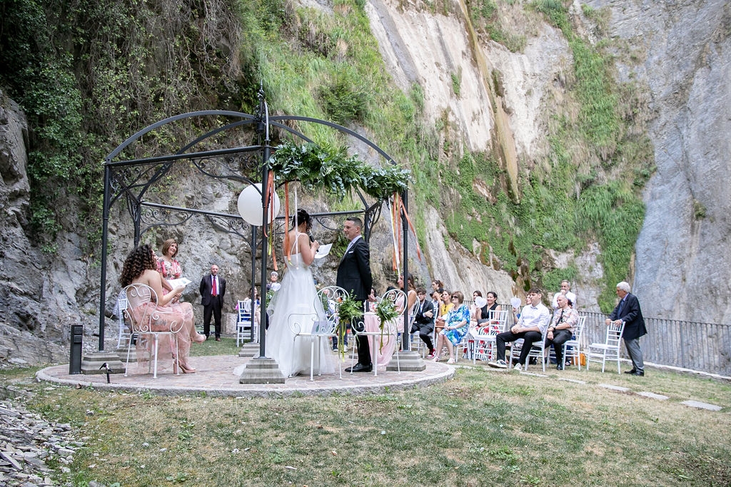 For their very intimated wedding Milena e Roberto dreamt a ceremony surrounded by nature. They choose a garden at the bottom of a waterfall (unluckly the summer was very dried and the water was really a little). The atmposphere was very moving cause both of them were taken to the altar by their daughters, who read two personal letter during the ceremony.