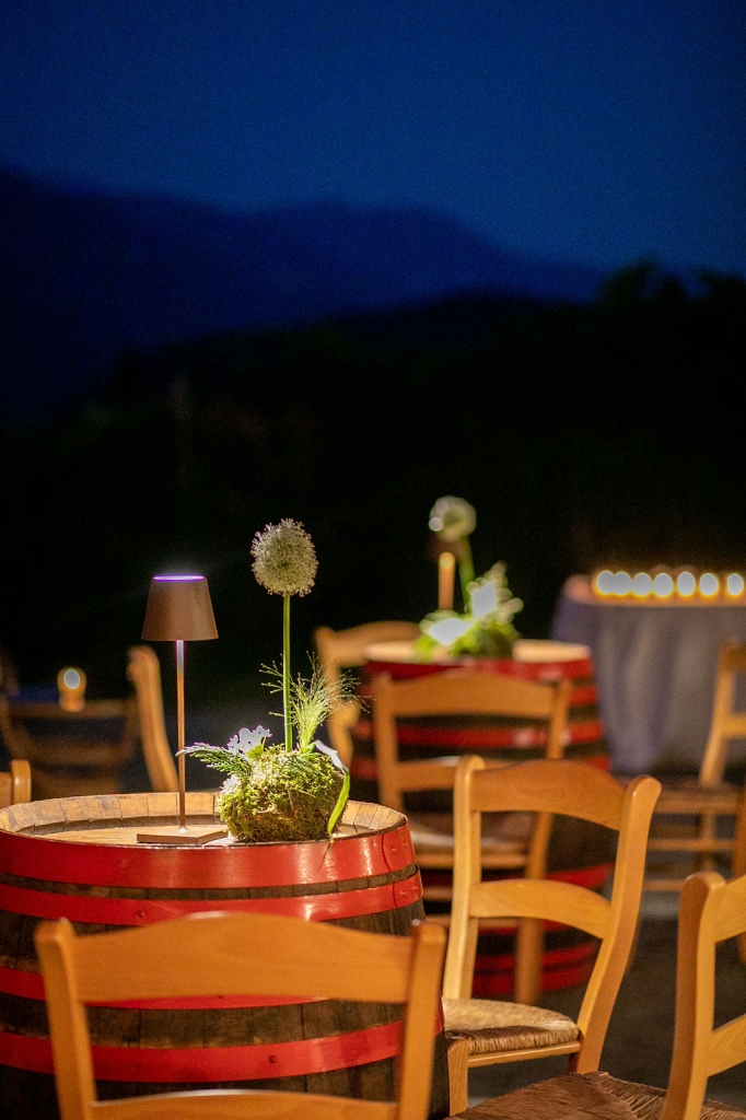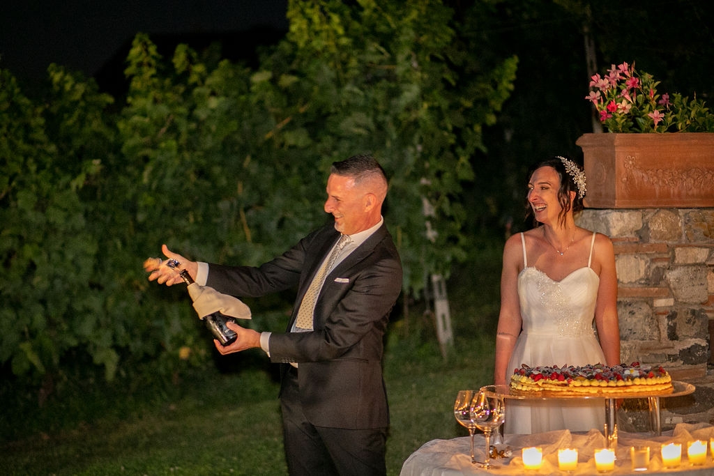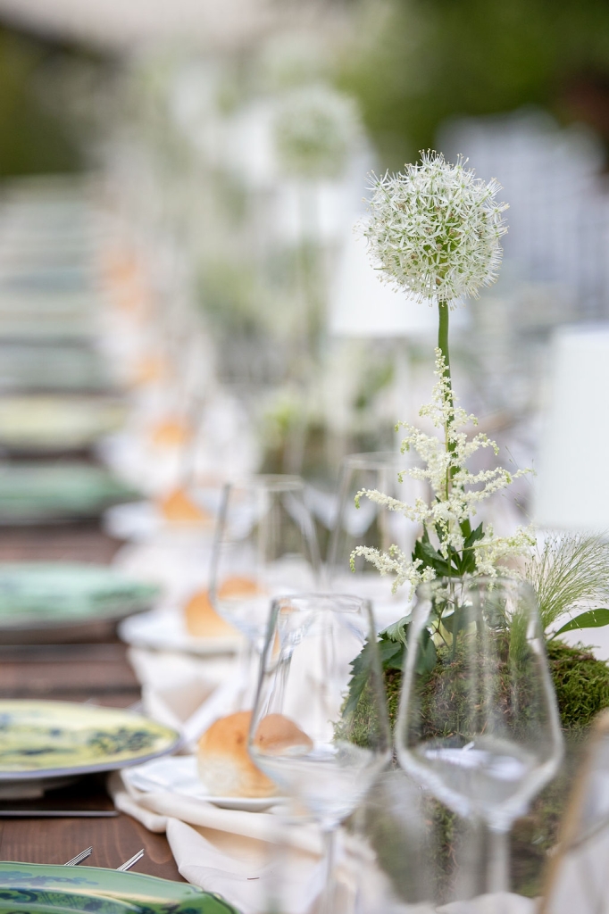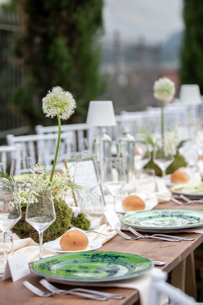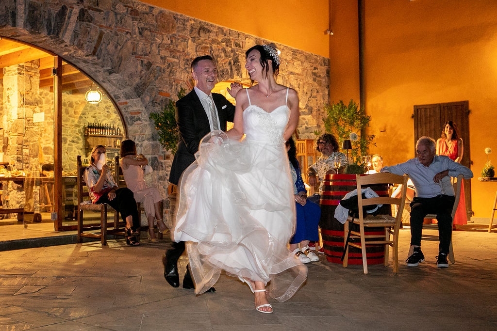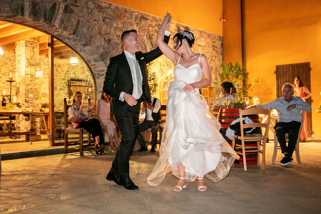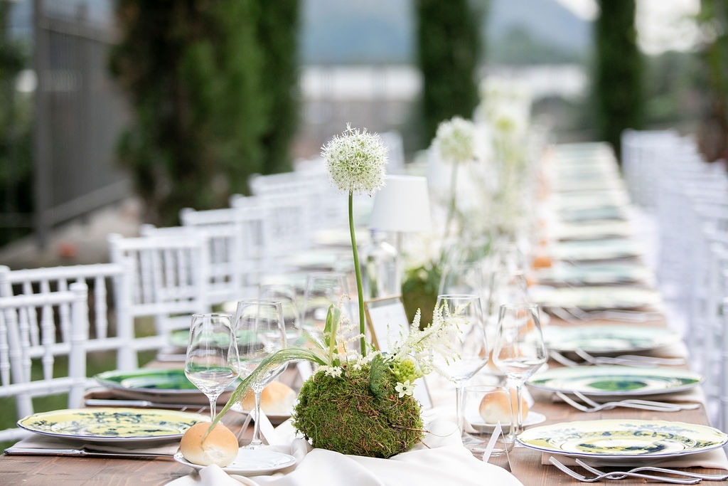 The reception was instead in a wine cellar: the aperitivo buffet on a panoramic terrace, the dinner among the rows of vineyard. Simple white and green flower decorations was combined with elegant painted pottery. The party was informal, with a touch of Latin dance, a passion shared by the couple.