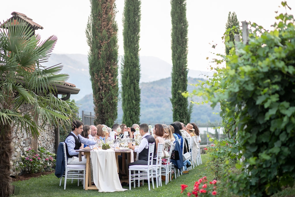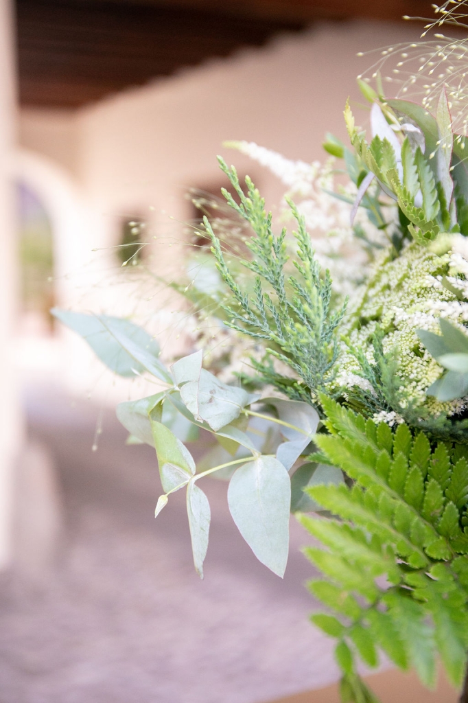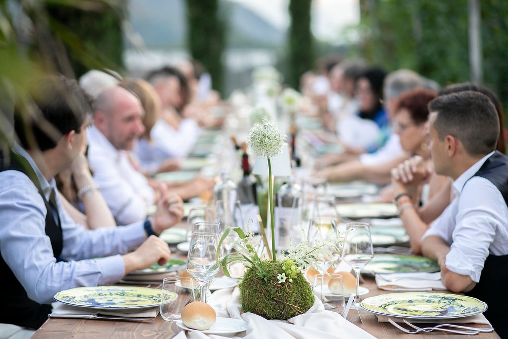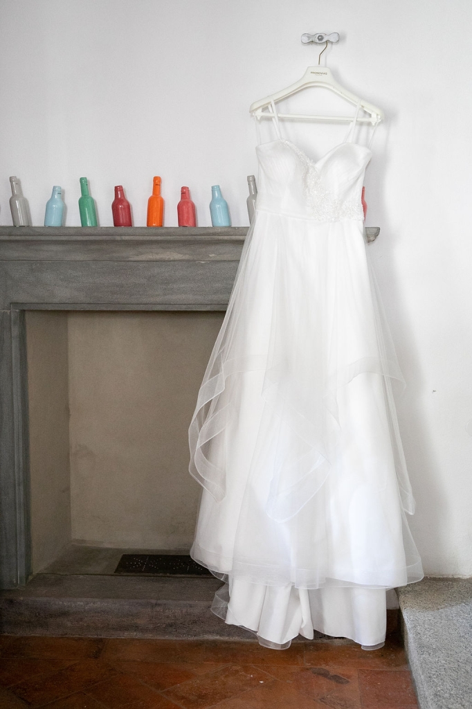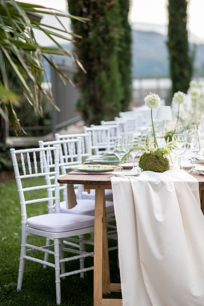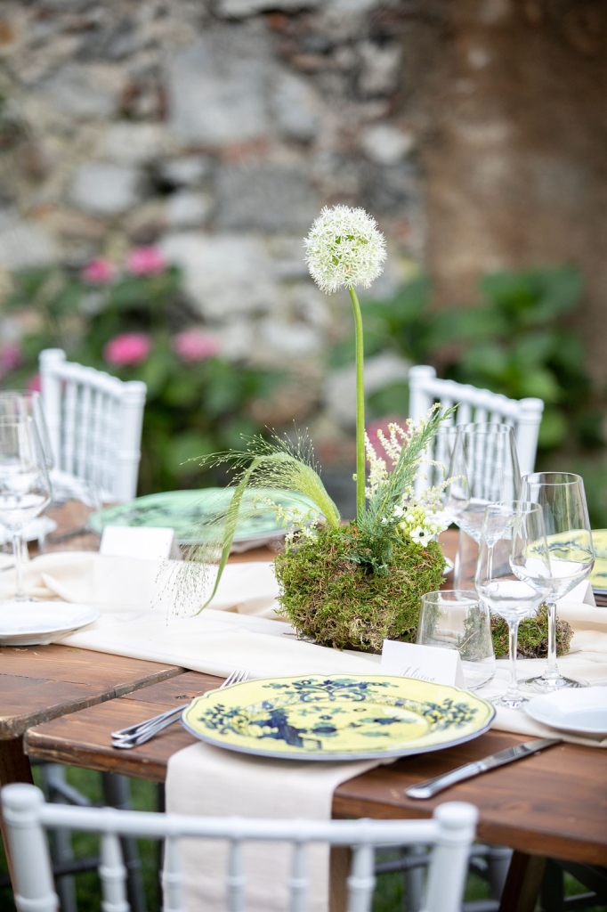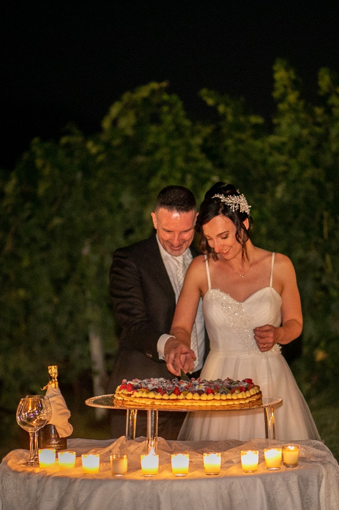 The reception was instead in a wine cellar: the aperitivo buffet on a panoramic terrace, the dinner among the rows of vineyard. Simple white and green flower decorations was combined with elegant painted pottery. The party was informal, with a touch of Latin dance, a passion shared by the couple.