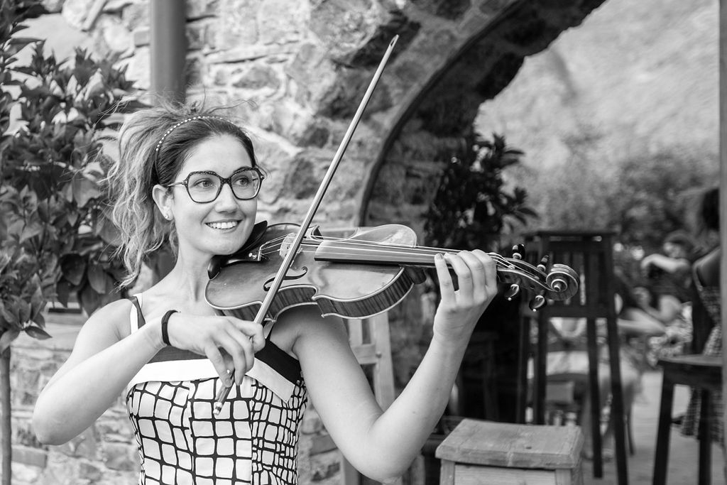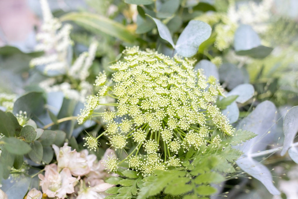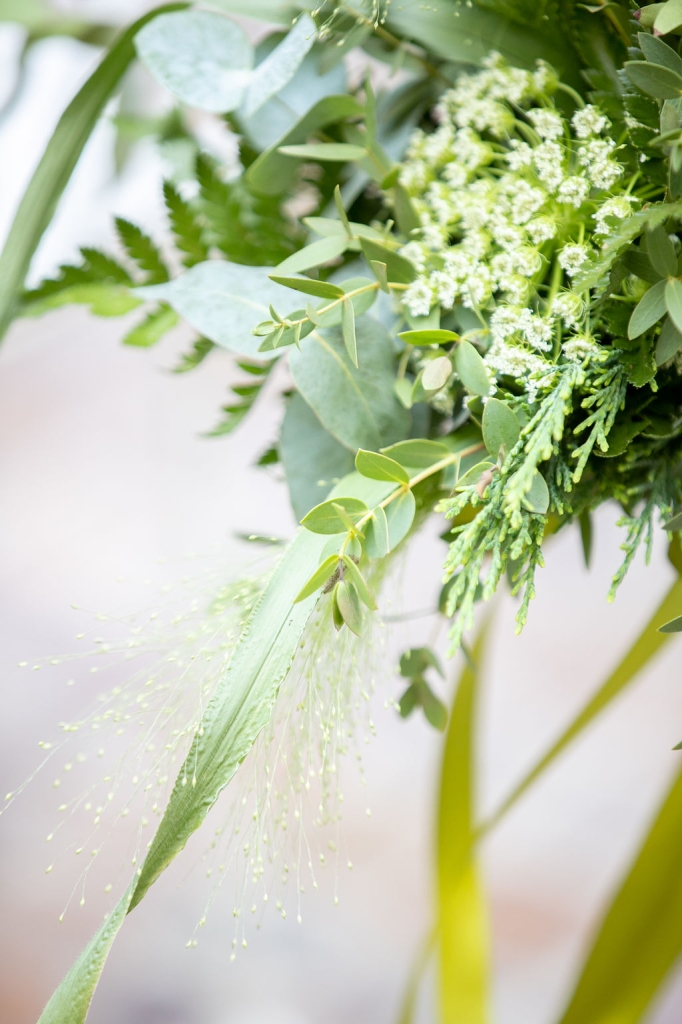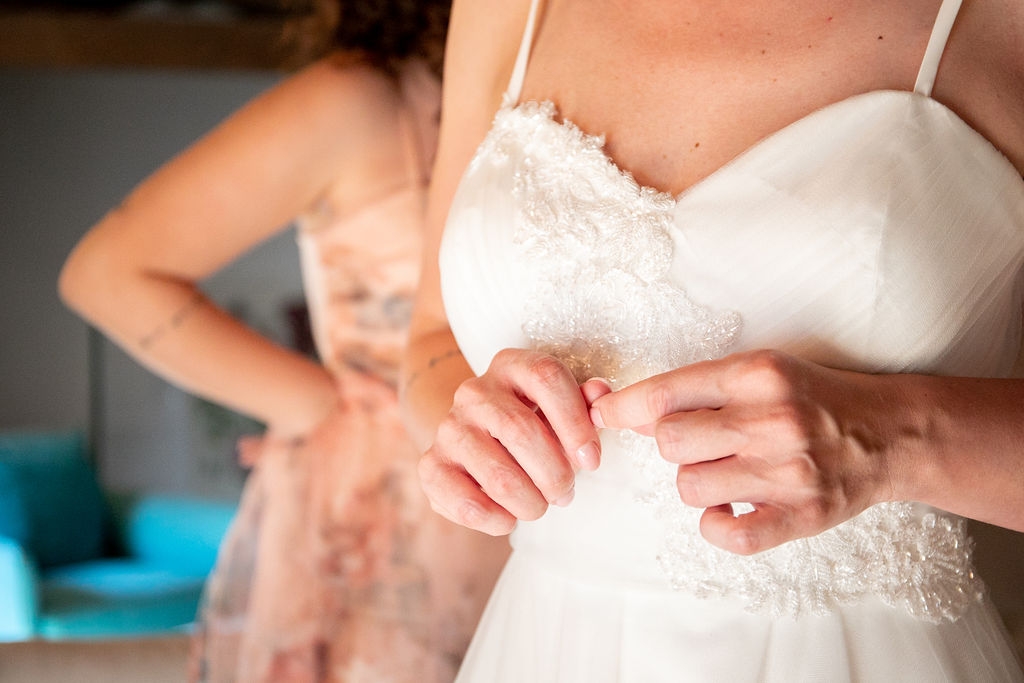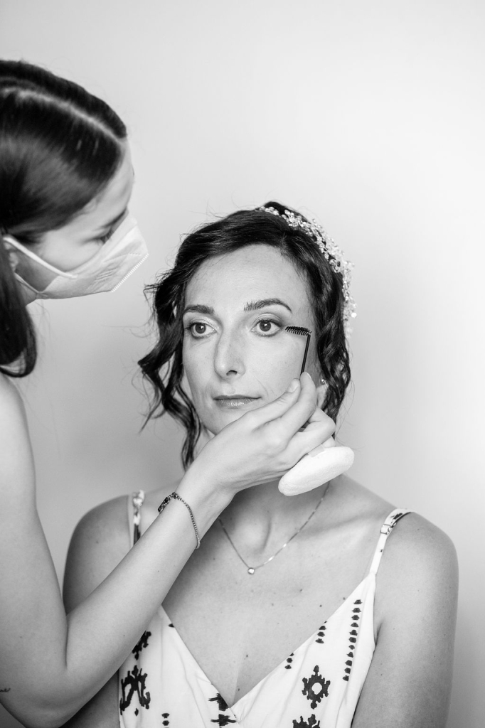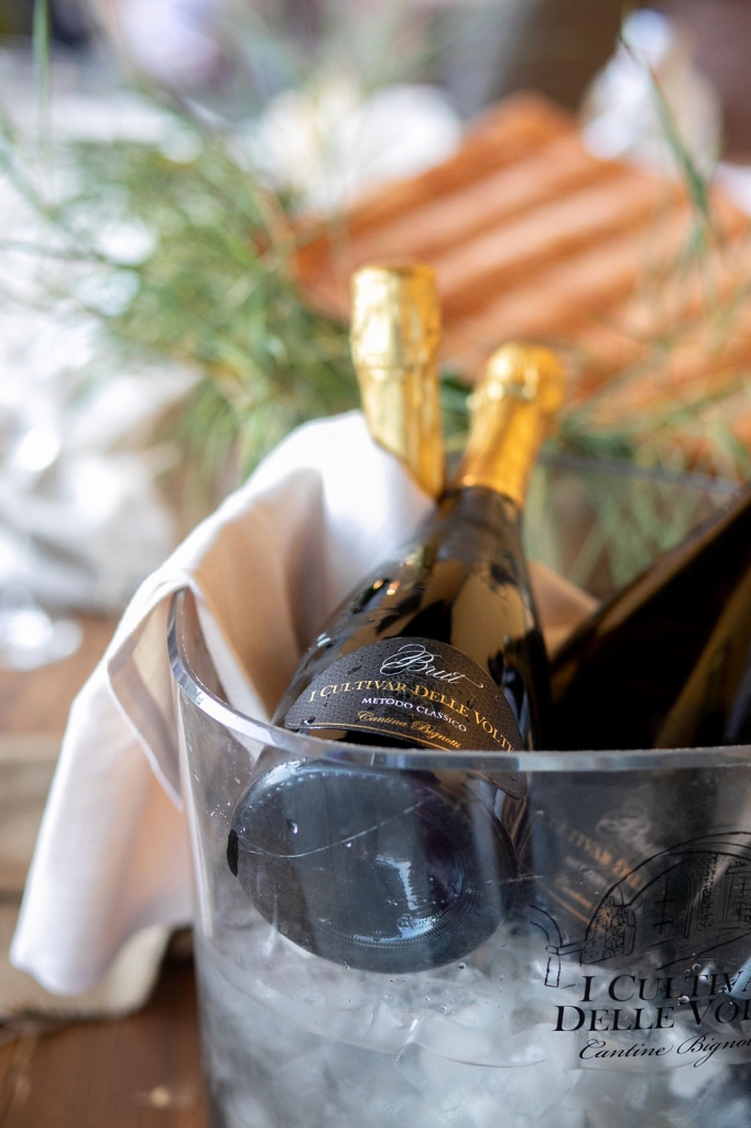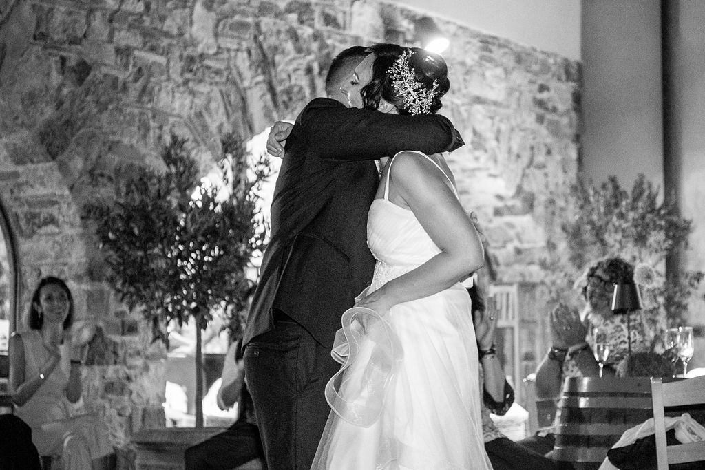 The reception was instead in a wine cellar: the aperitivo buffet on a panoramic terrace, the dinner among the rows of vineyard. Simple white and green flower decorations was combined with elegant painted pottery. The party was informal, with a touch of Latin dance, a passion shared by the couple.